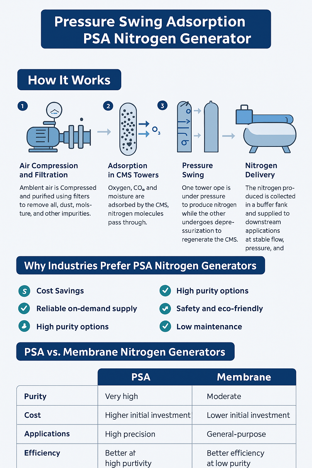 As industries demand higher purity nitrogen with lower operating costs, the Pressure Swing Adsorption nitrogen generator has become one of the most widely adopted solutions.