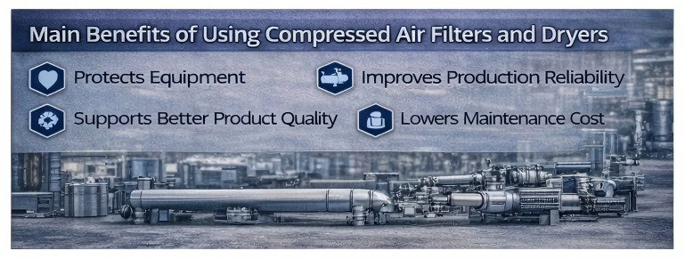 Compressed air filters and dryers work together to remove impurities and moisture before compressed air reaches downstream equipment or production processes. They help protect machinery, reduce maintenance costs, improve system efficiency, and support more stable production conditions across a wide range of industries.