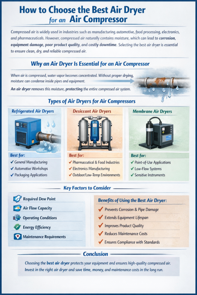 Compressed air is widely used in industries such as manufacturing, automotive, food processing, electronics, and pharmaceuticals. However, compressed air naturally contains moisture, which can lead to corrosion, equipment damage, poor product quality, and costly downtime. Selecting the best air dryer for an air compressor is essential to ensure clean, dry, and reliable compressed air.