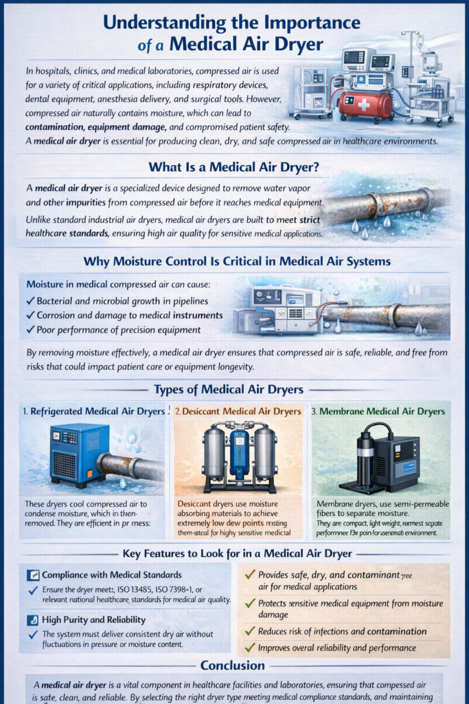 A medical air dryer is a vital component in healthcare facilities and laboratories, ensuring that compressed air is safe, clean, and reliable. By selecting the right dryer type, meeting medical compliance standards, and maintaining optimal performance, medical facilities can protect both their equipment and patients. Investing in a high-quality medical air dryer is an essential step toward safer, more efficient healthcare operations.